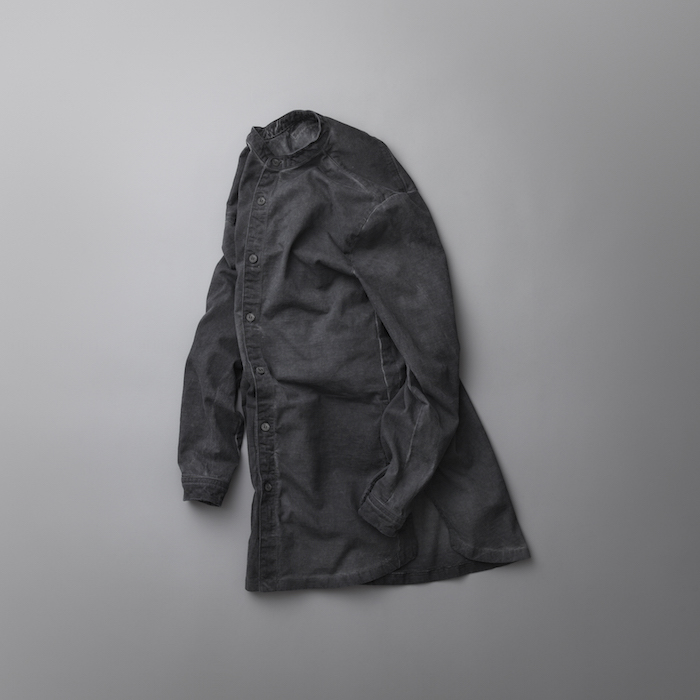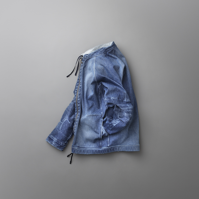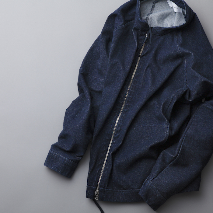 ライダースのような立ち襟はシャツやパーカーを中に着てもかさばらず、