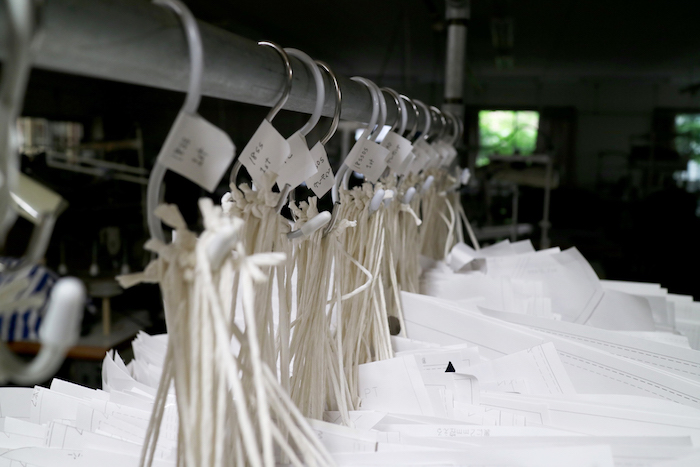 今回はジャガード素材を縫い合わせているので、それを考慮しながら裁断や縫製をしています。