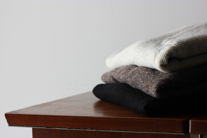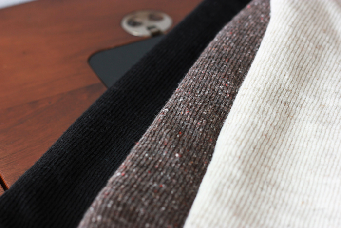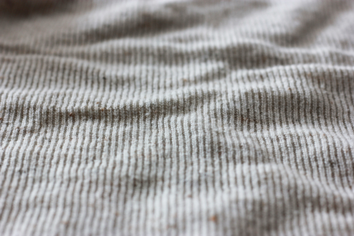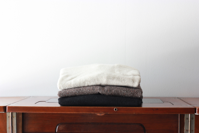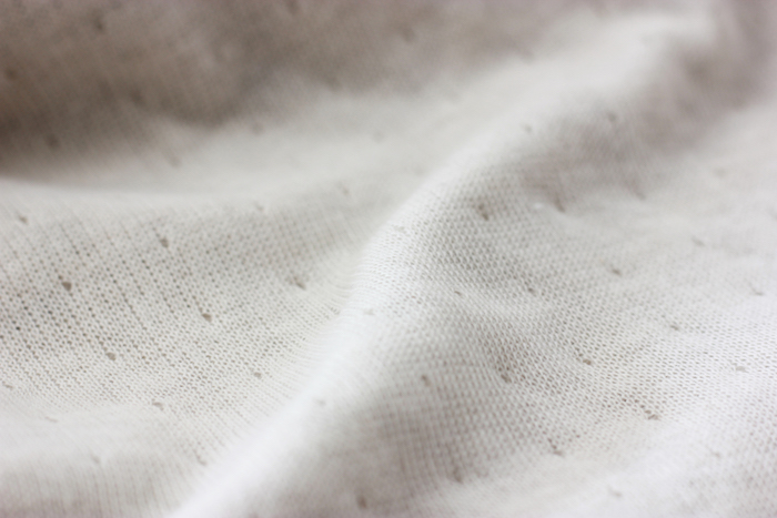 交互に針を抜くことでタテ目が立つように編み立てたオリジナルファブリックは、