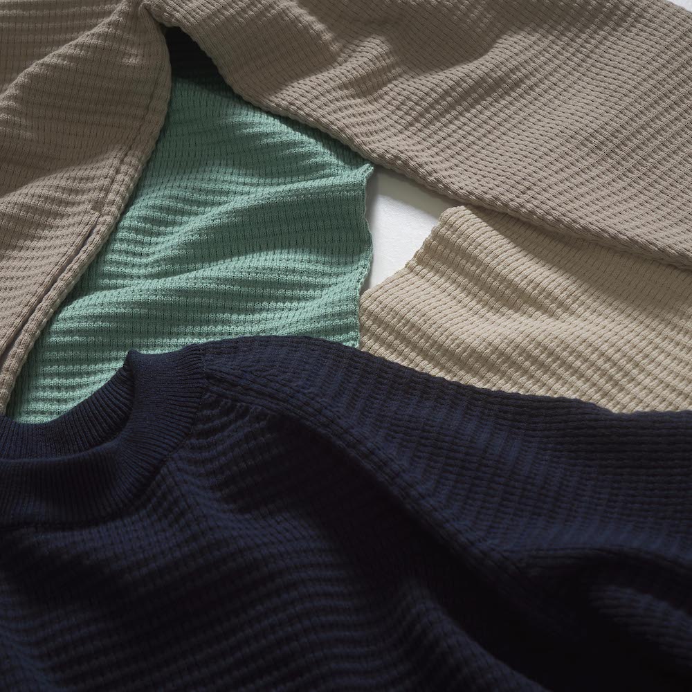 コットンベースに伸縮性のあるポリエステル糸を裏側に入れ、目が引き締まることで立体的な凹凸のある表面感とハリのあるシルエットを構築しています。