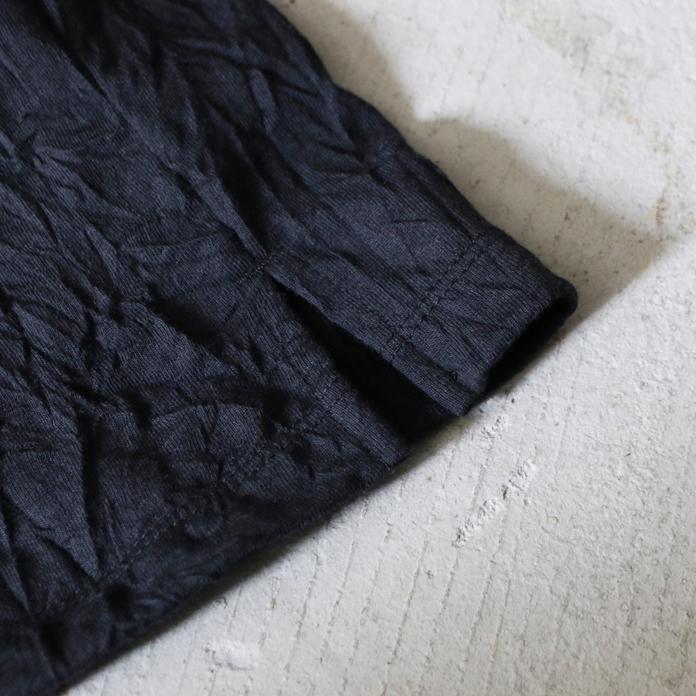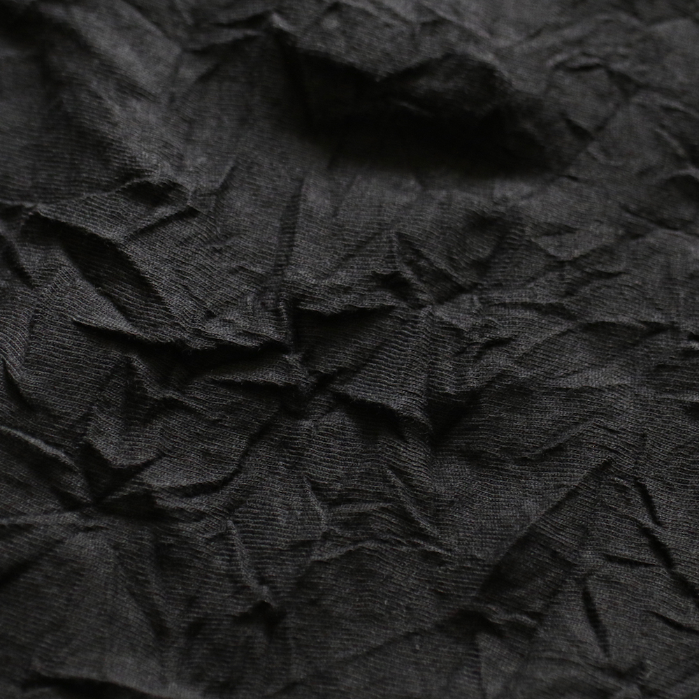 しっかりとした生地に適している程の太さのポリエステル糸とコットン糸をブレンドさせて、さらにシワ加工を施した天竺ジャージになります。