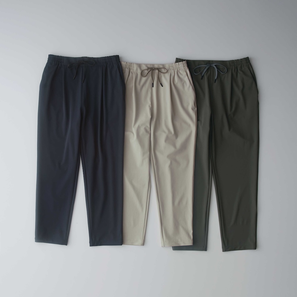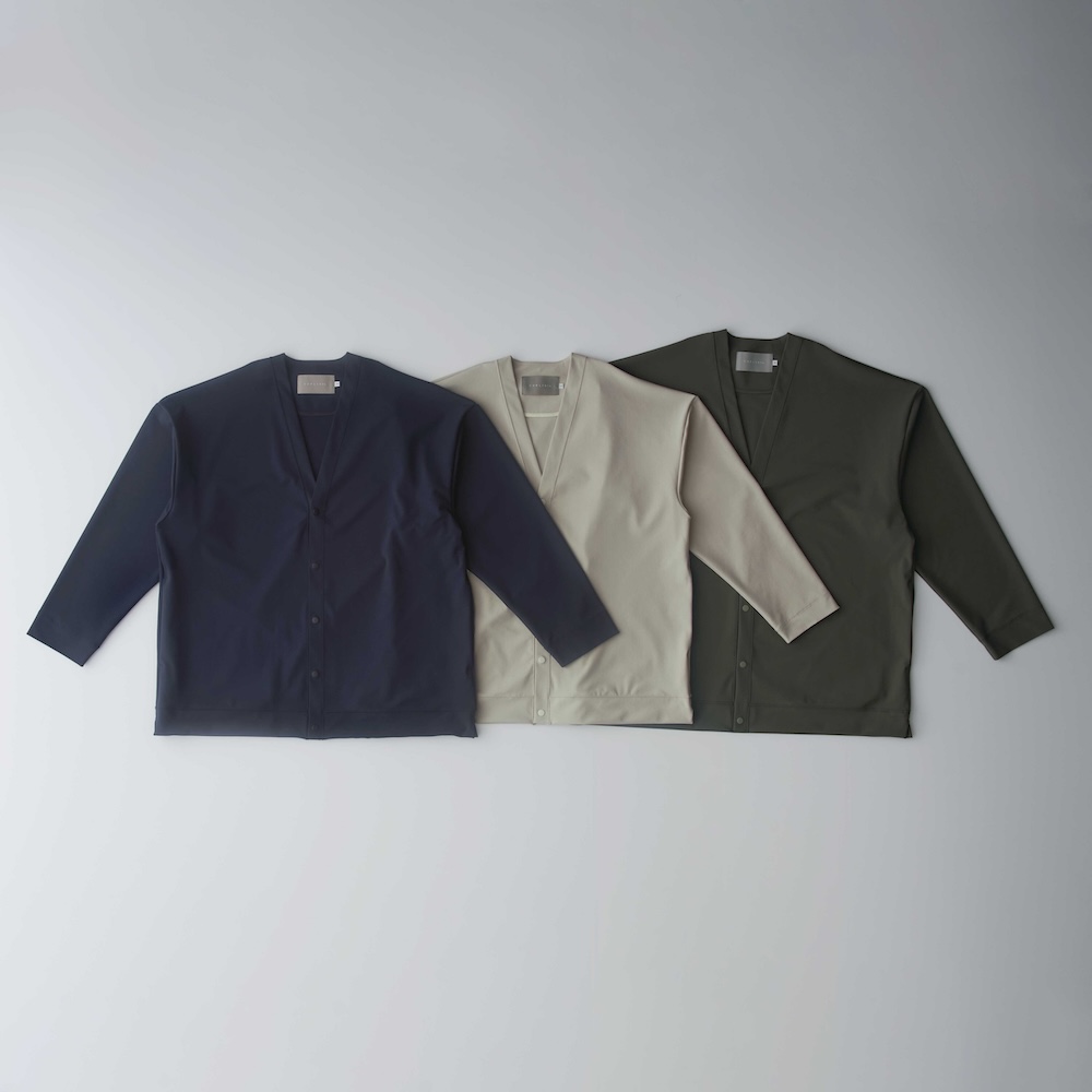 まずは紫外線を抑制、接触冷感性のある涼しく爽やかな着心地が特徴のトリコット素材を使用したセットアップ、DRY COOL TRICOT CARDIGANとDRY COOL TRICOT 1TUCK EZ PANTS。