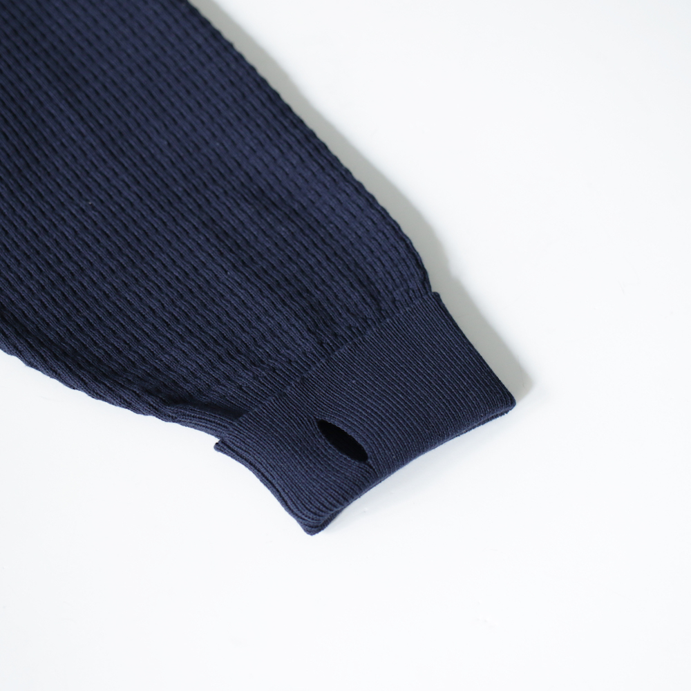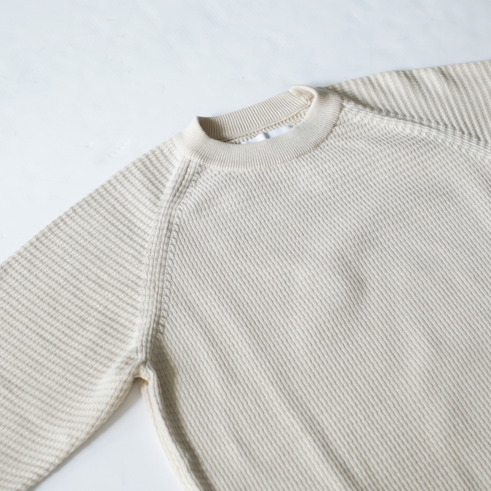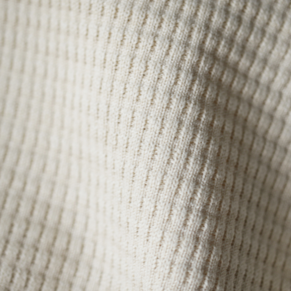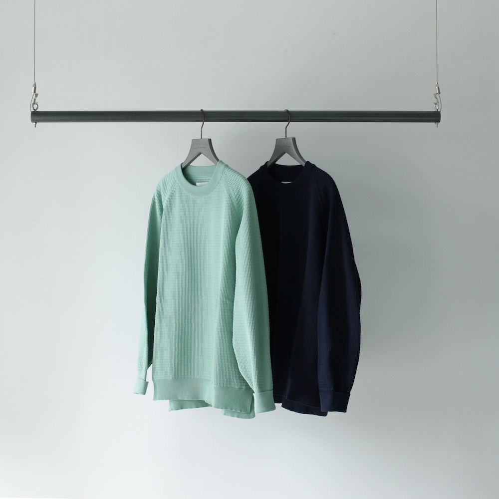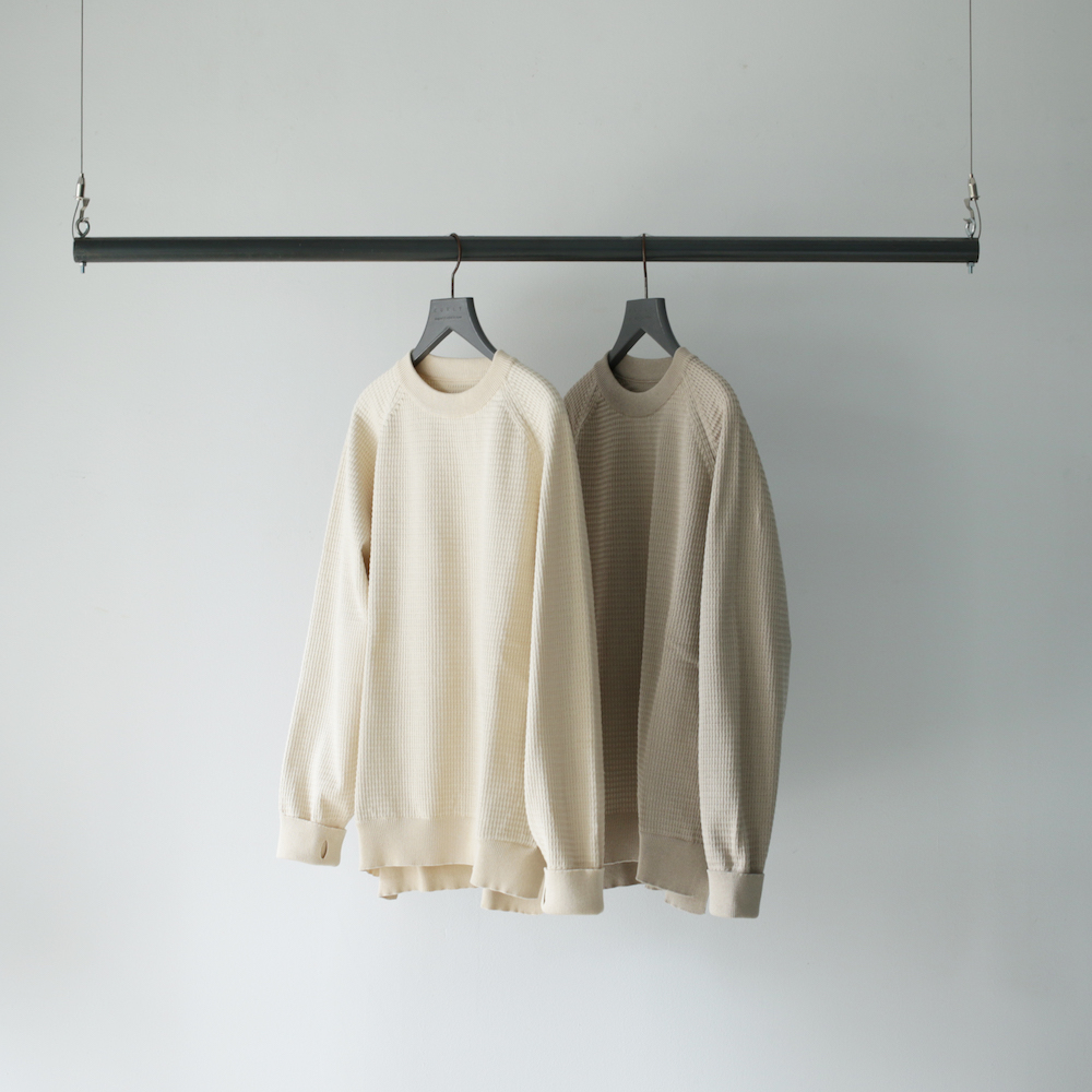 立体感のあるざっくりとした編み生地は毛羽がなくすっきりとした表面感で、どこかワッフル生地のような雰囲気も醸しだし、春夏らしいクリーンな表情に仕上がっています。