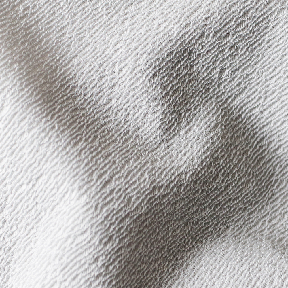 表から見た時に、スポーティな印象も受けるツルッとした表情なのですが、その裏側は柔らかなパイル状のハイゲージ裏毛とギャップのある表情を持った生地。