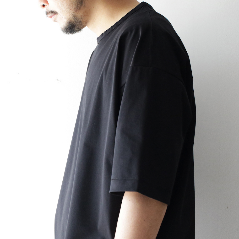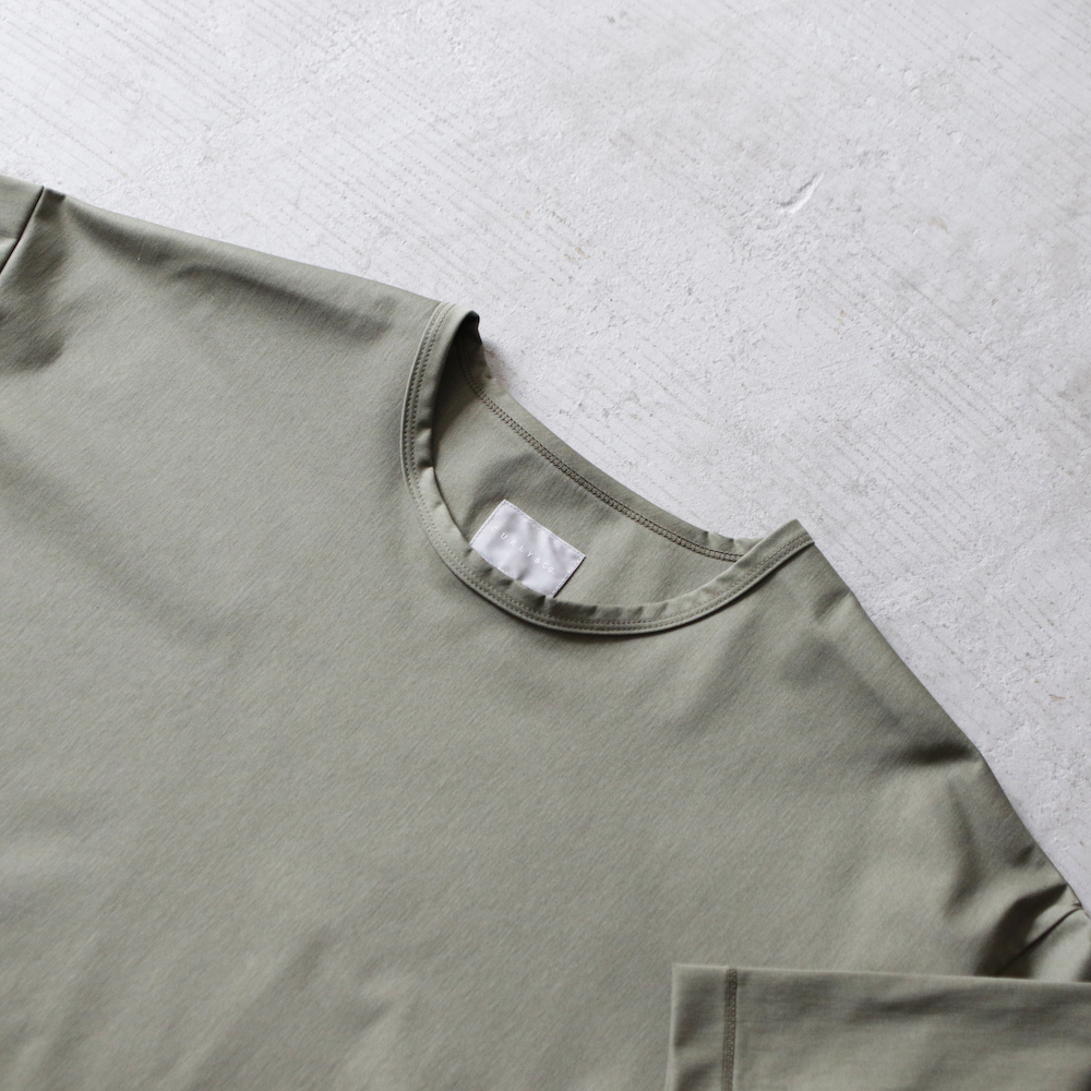 複雑に絡み合う経糸によって構成されたトリコット素材で、ポリエステルベースに肌触りの良いコットンをブレンドさせることで、カット素材らしい着心地と布帛ライクな表情を表現しています。
