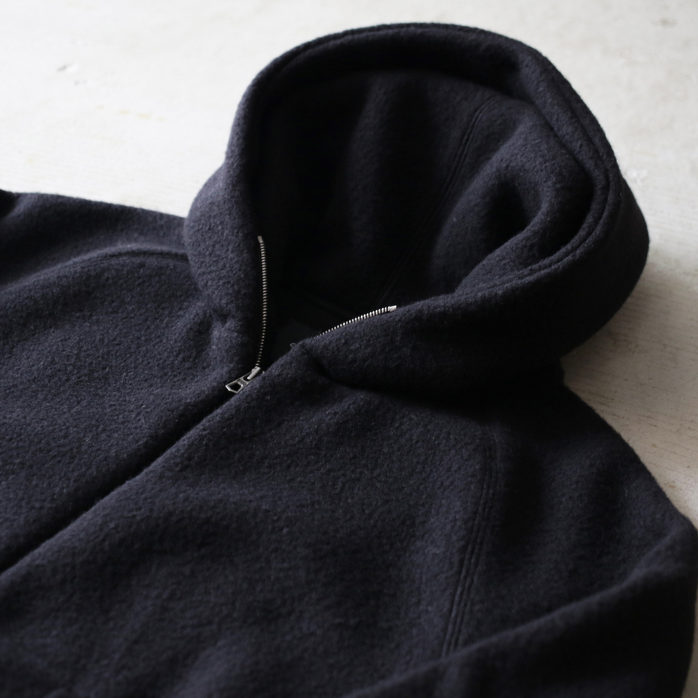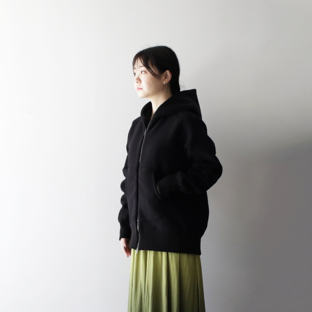 肉厚な素材と、起毛したボリューム感のある表面感に仕上げることで、一般的なパーカのイメージと比べ、よりアウター感を感じさせます。