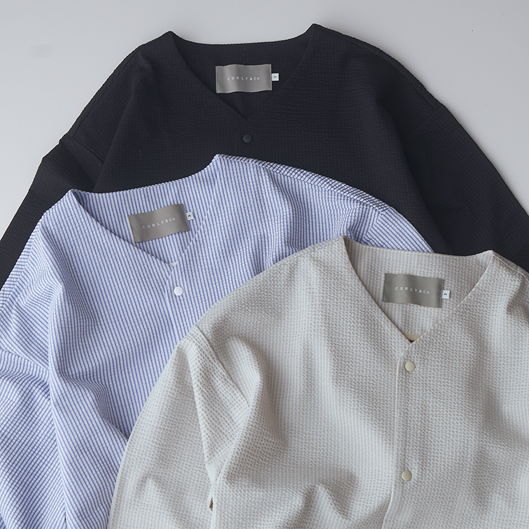 CURLY&Co.では人気が高く毎シーズン企画される素材、コットンにボリエステルをブレンドさせたシアサッカージャージー素材を用いており、そちらで定番のスナップボタンカーディガンを作製しました。