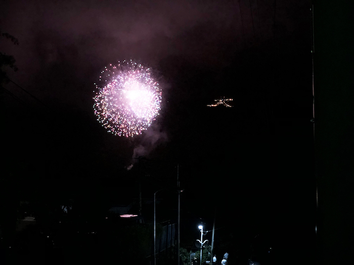夜店の周辺は大勢の人で賑わっていましたが、僕が花火を鑑賞していたのは地元感溢れる道端の石垣。笑