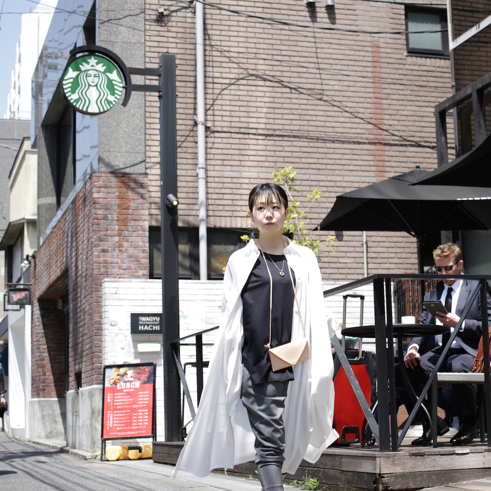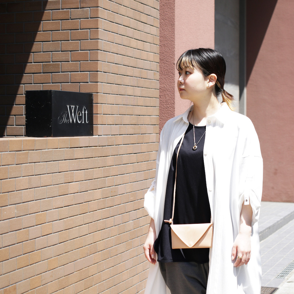 ◯△□のショルダーウォレットや、HARIOのアクセサリーなどを合わせて気持ちの良い5月の天気にぴったりな軽快でシャキッとしたスタイリングに。