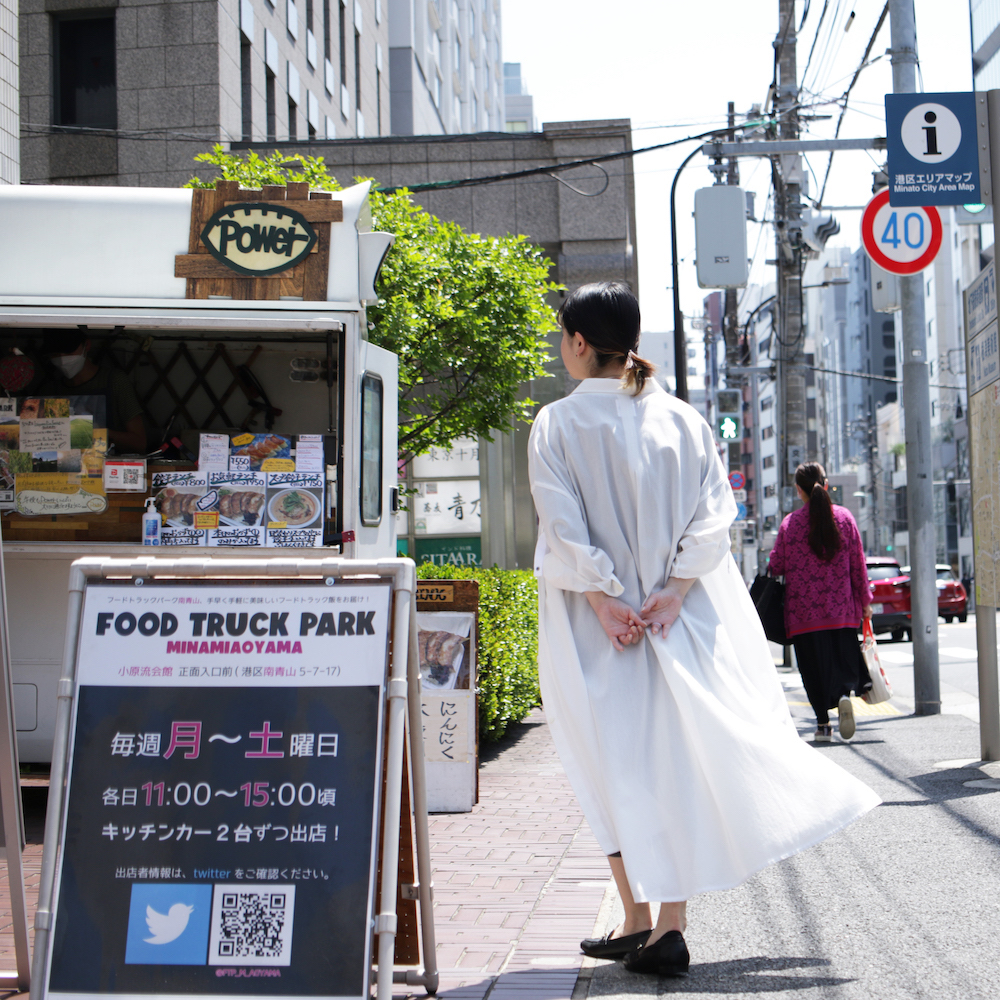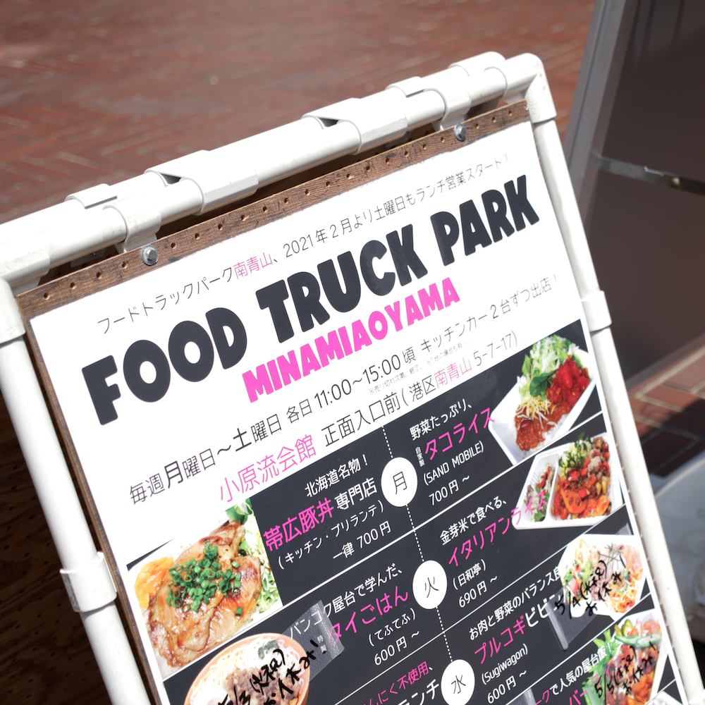 これまた骨董通りでは有名な「小原流会館」のエントランス前は現在「FOOD TRUCK PARK」という名前で、様々な料理がお昼時フードトラックで販売されています。
