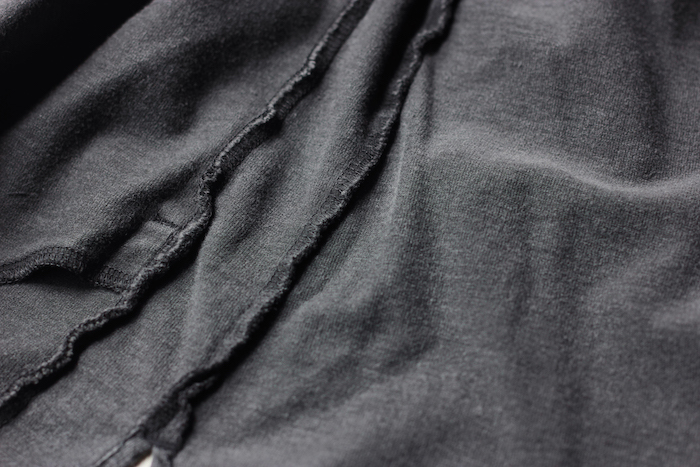 また、通常 1 本の糸を通す編み機に 2 本通す事で目を詰め生地にハリ感を持たせています。