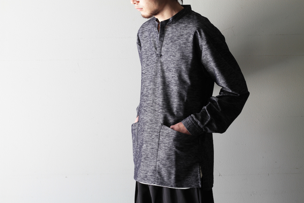 カラーレスのシャツに特徴的なフロントポケットをつけたプルオーバータイプのシャツですが、
