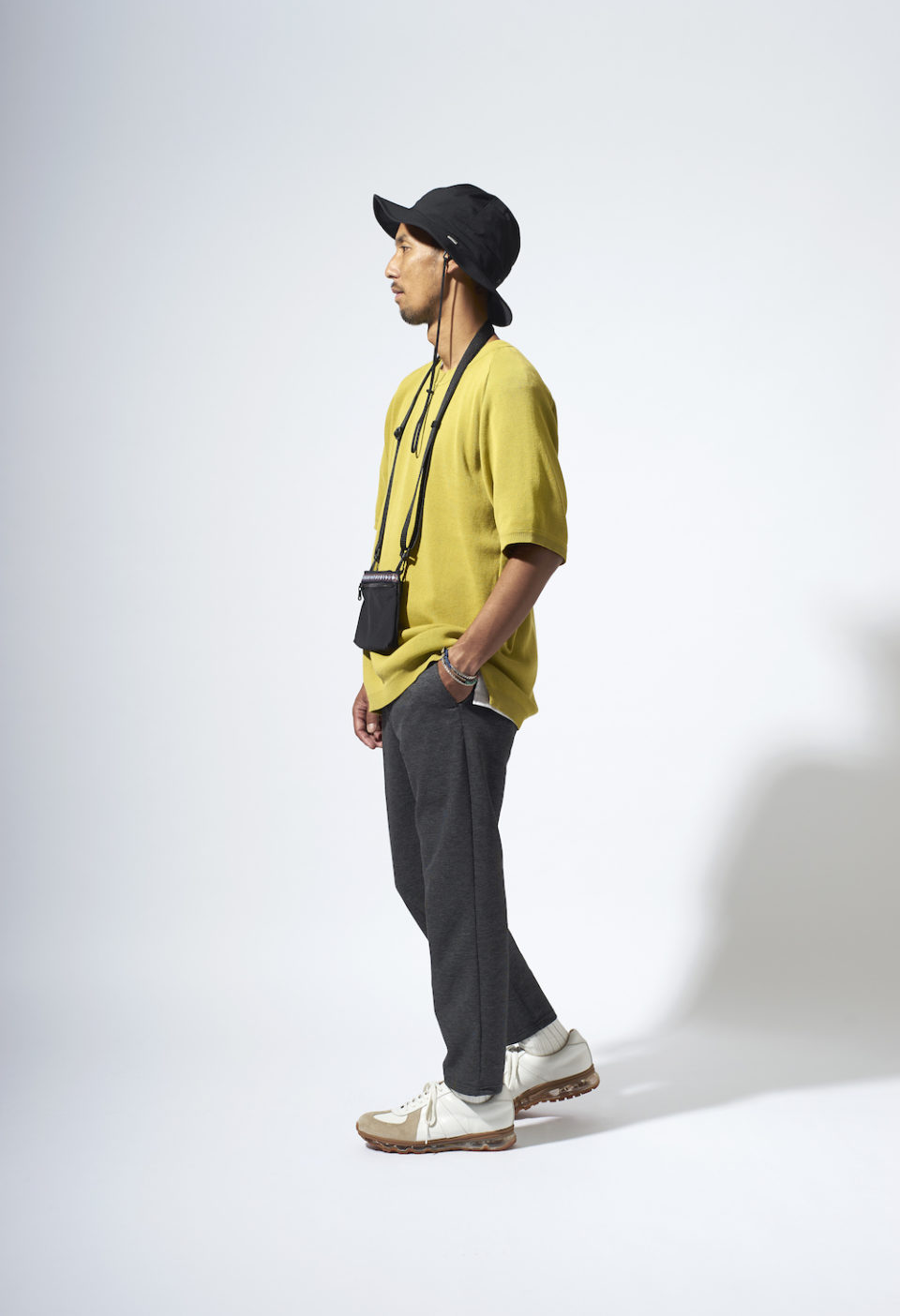 ハットやサコッシュ、ショーツなどラフなアイテムを使用していますが、