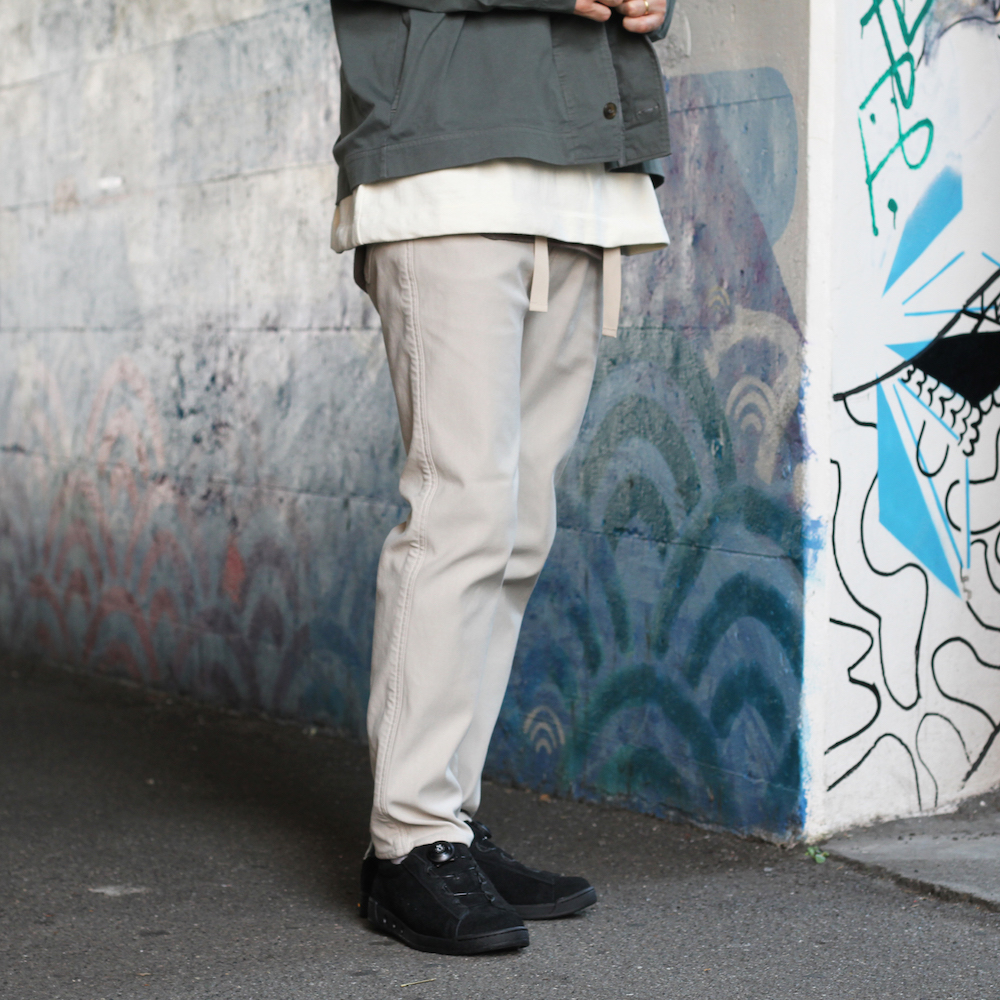 明るくもグレイッシュなカラーはトップスとのメリハリをつけつつ、