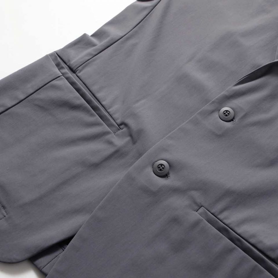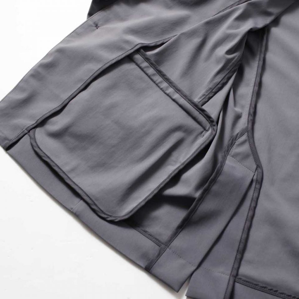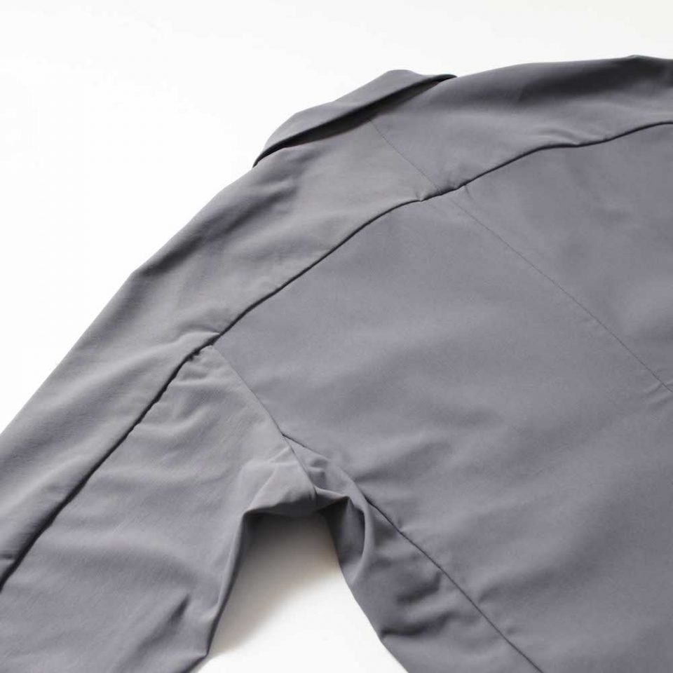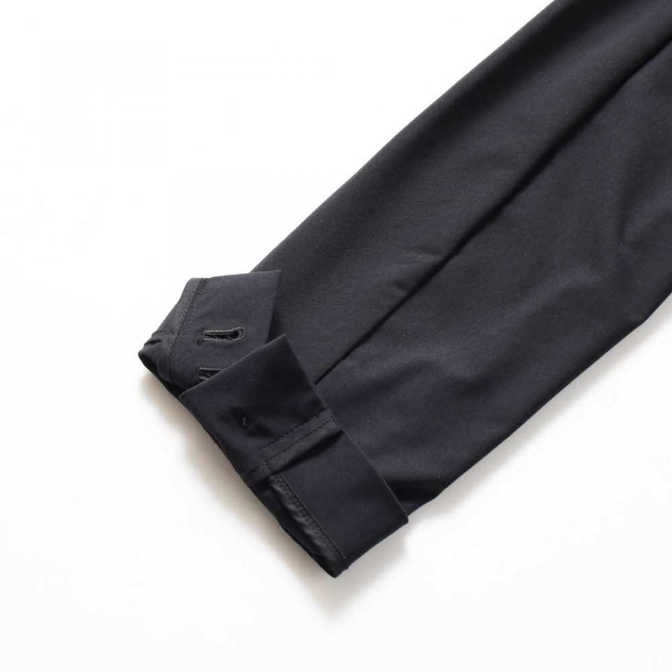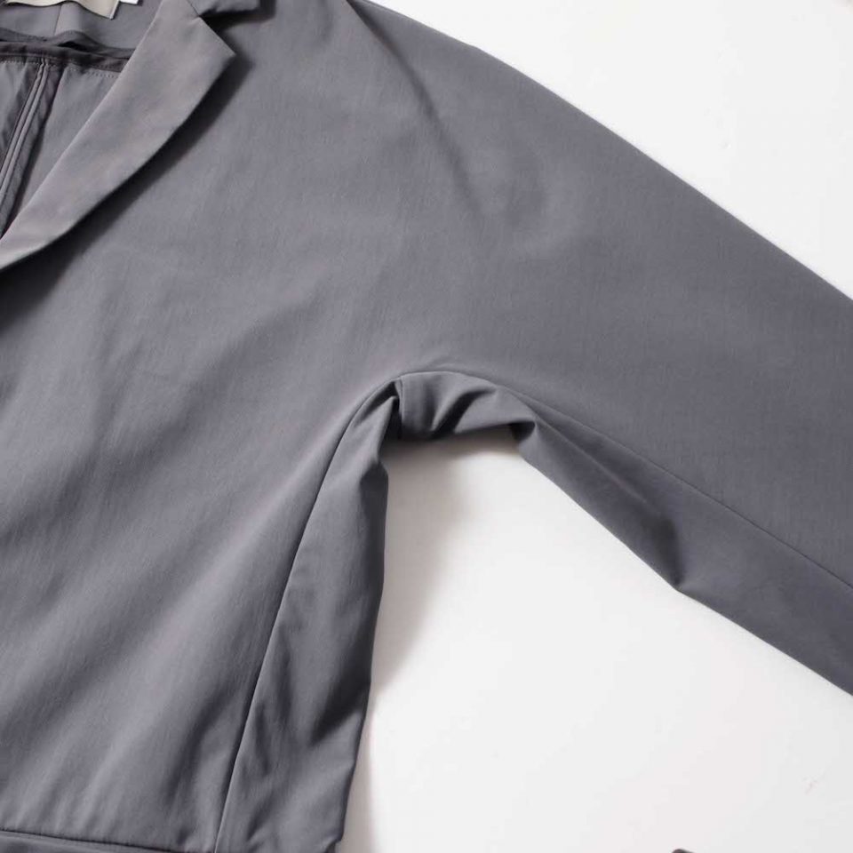 独特な型紙を使ったアイテムですが、襟やフロントのポケット、本切羽の袖口は、テーラードジャケットらしさをそのままに採用してます。