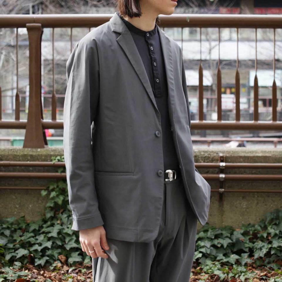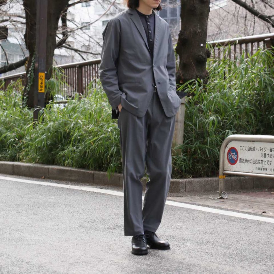 そんな中、本日ご紹介するのはこれまでとは全く異なる存在感のアイテムに仕上がったKIMONO SLEEVE TAILORED JACKETとKIMONO TAPERED TROUSERSを使用したスタイリング。