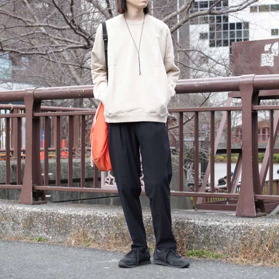 ここに合わせたのはある意味では綺麗めのスラックスとは真逆の印象を持ったクルーネックスウェット。