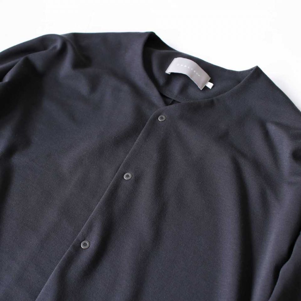 首元はノーカラーのデザインで、Vラインを描くようなシャープなネックラインが印象的です。