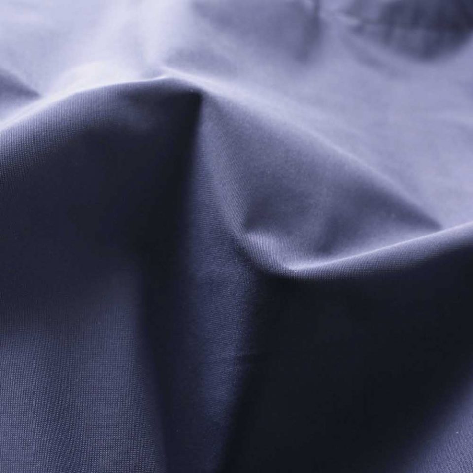 写真のように、高密度で縦に目を詰めて編み込むことでバックサテンのような深い光沢が生まれ、無駄なシャカシャカ感もなく伸縮性をもちながらもハリのある生地感になっています。