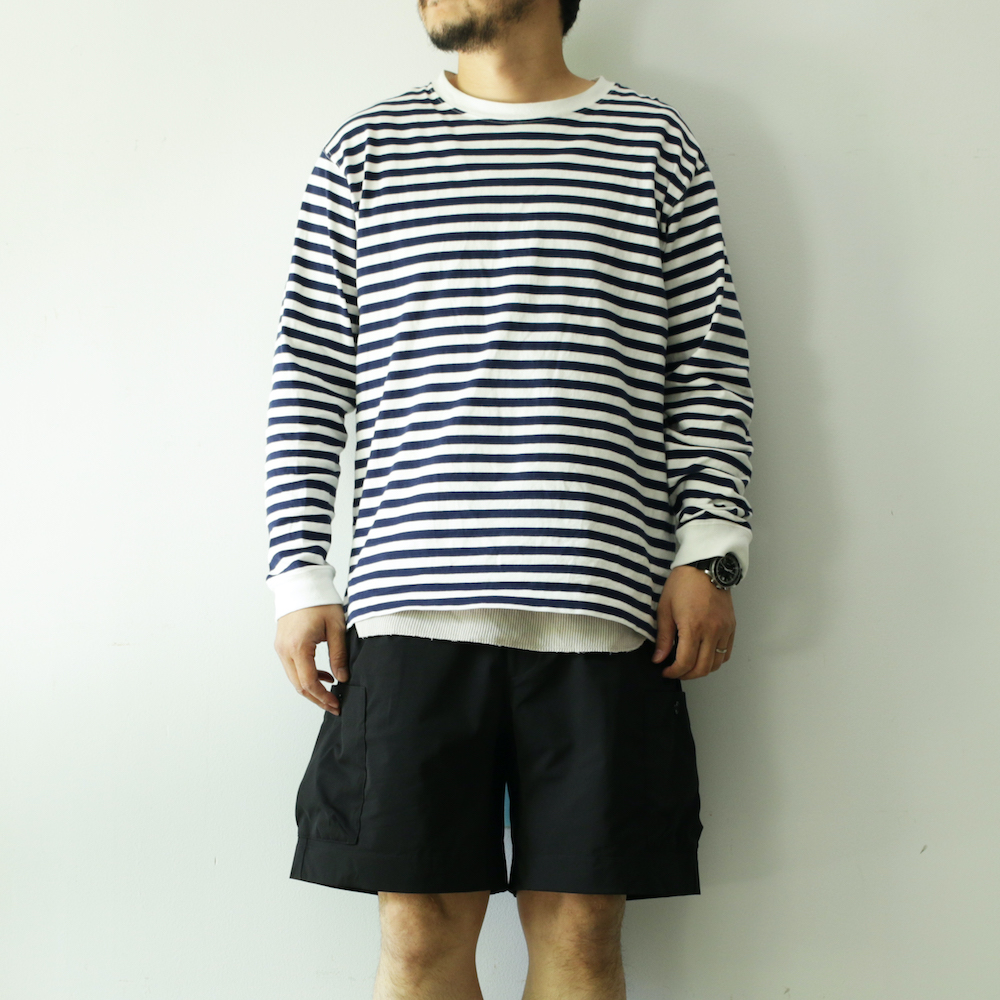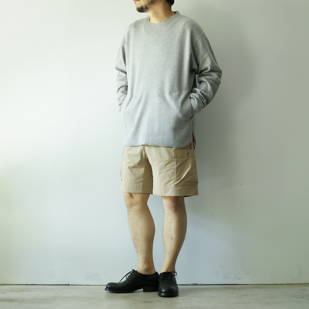 SWEATとロンTEEの中間くらいの素材感ですので、ショーツと合わせたくらいが天候的にもちょうどいいかなと。