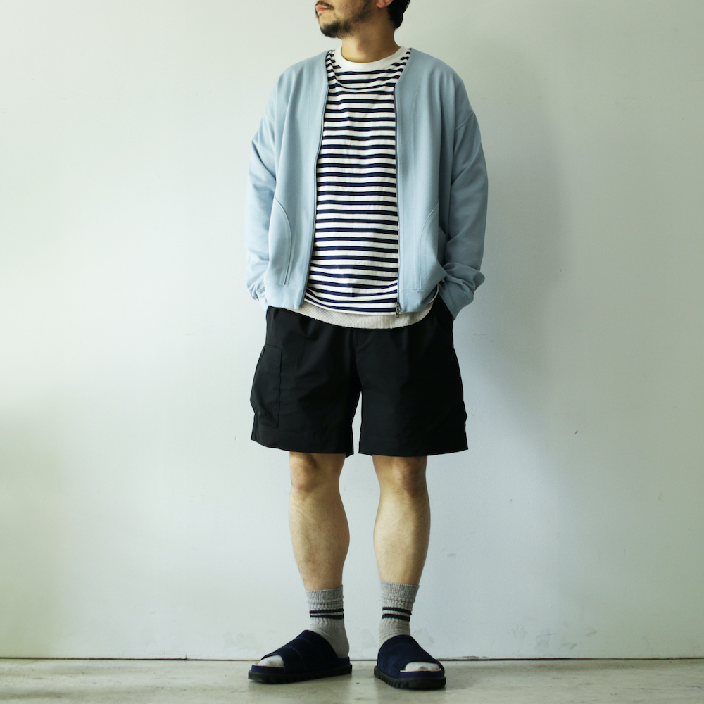 これがボトムスがフルレングスだと、素材感やシルエットによってはちょっと暑苦しくなる可能性もあるのですが、ショーツで合わせればタイムリーな印象です。