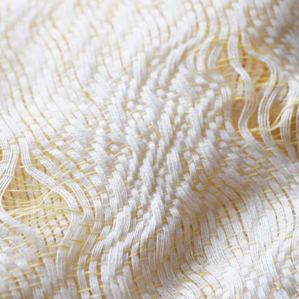 縦糸と横糸を一定の規則で交錯させてできるのが織物で、編み物よりもハリ感があります。