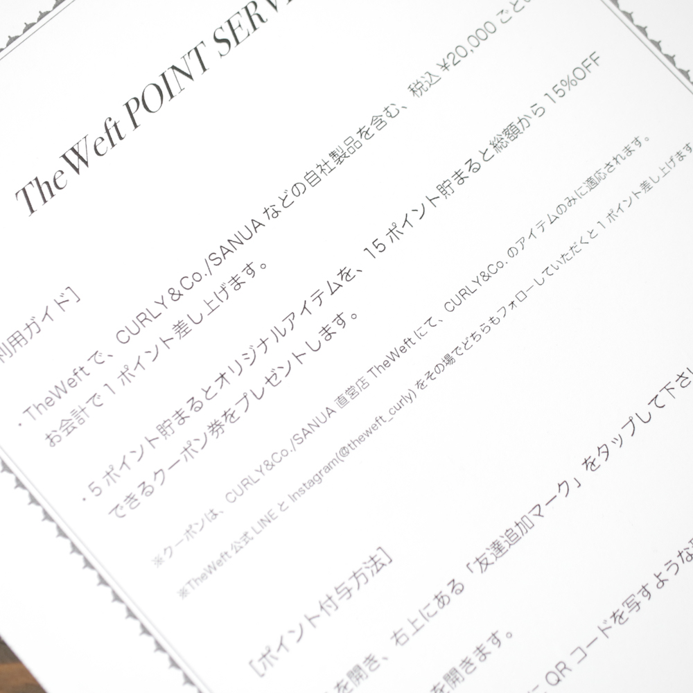また直営店TheWeftでは、公式LINE(TheWeft/CURLY)でショップカード(ポイントカード)制度を行っております。