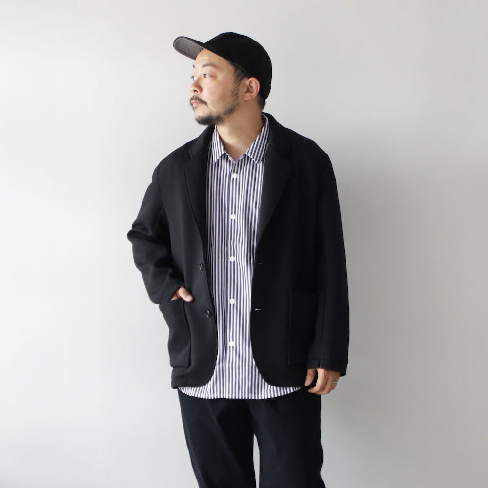 チャキっとしたコーディネイトに見えながら、ジャケットもシャツもどちらもカットソー素材なので着心地はとても柔らかく、肩の力を抜いて洋服をお楽しみいただけます。