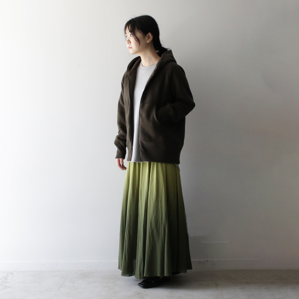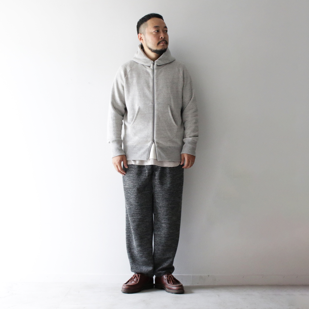 フードの立ち姿だけでもコーディネイト全体の見え方は大きく変わってきますが、この綺麗なシルエットのおかげでジップパーカでもカジュアルすぎない洗練された印象を与えることができます。