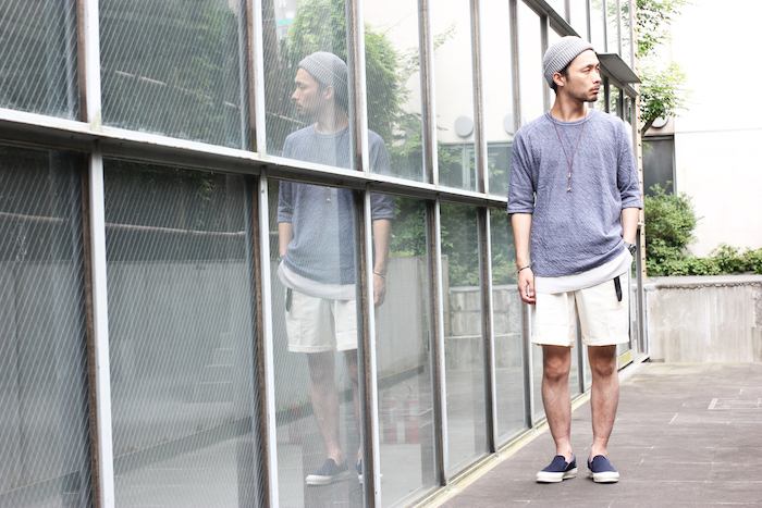 ショーツにはECRUカラー、中に合わせたタンクトップはライトグレーを組み合わせています。
