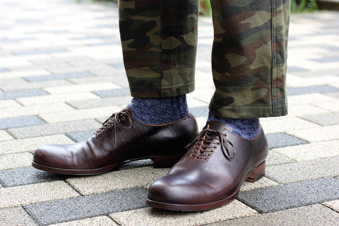 足元にもネイビー、そして少し綺麗な要素を革靴でプラスしています。