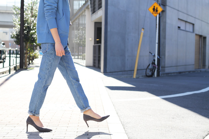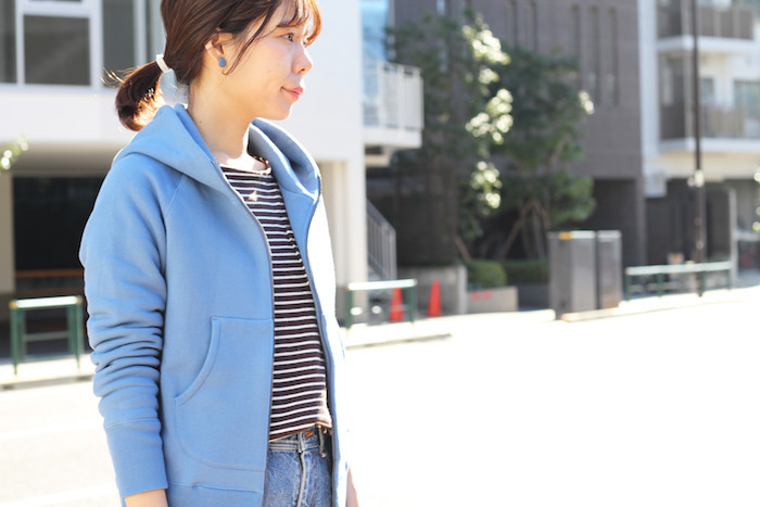 パーカの柔らかい質感とデニムのパリッとした素材感の差で、同色のコーディネートにも変化が生まれます。