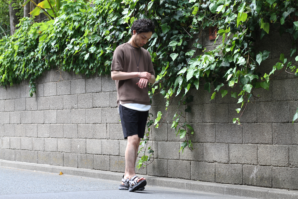 足元にはTOMO&COの別注サンダル、胸元にはTERRA のAULAと、