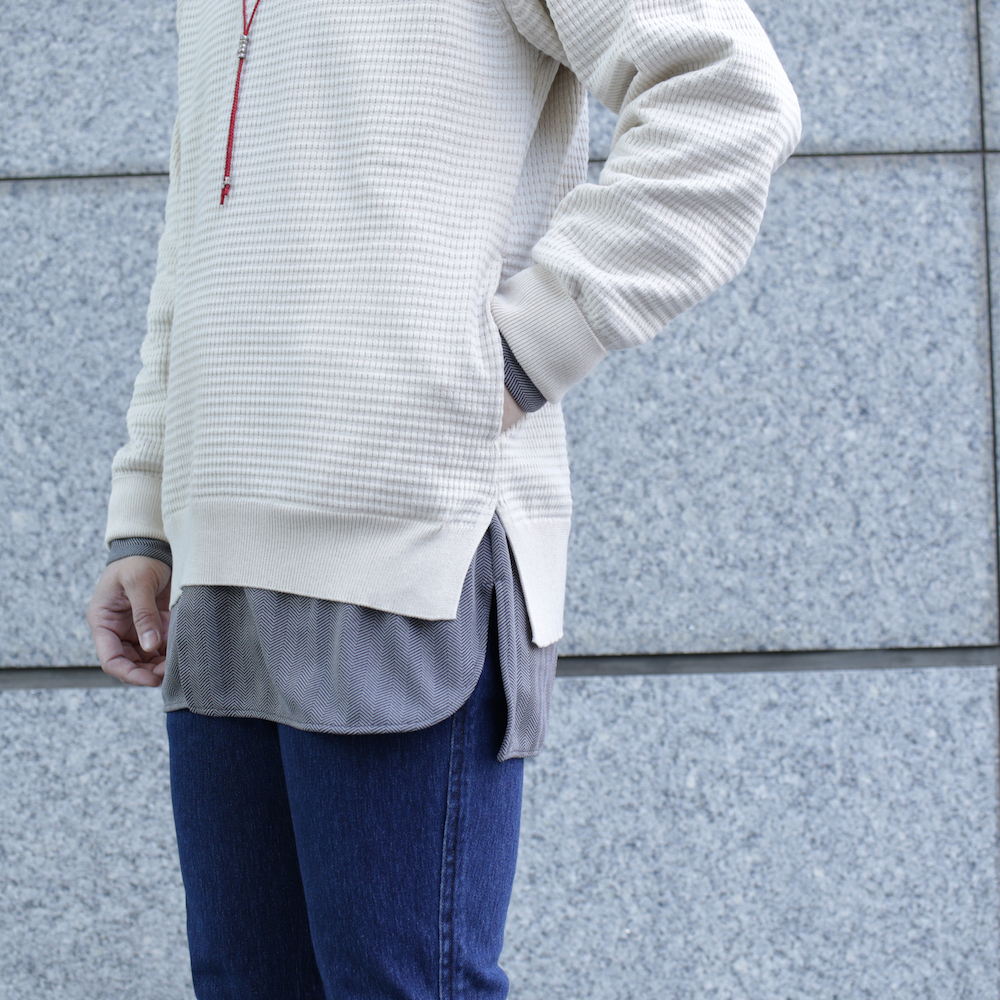 先日のJOURNALでもディテールについてご紹介しましたが、AZTEC CREW KNITは落ち感を抑えた立体的なシルエットでスウェットライクに着用していただけます。